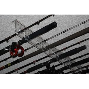 Product Description : FISHING ROD & REEL RACKS. Solid Clear acrylic 3/8" thick. 6 place racks are designed to be mounted to the ceiling in your yacht, RV, the coolest garage, game room or basement. The clear acrylic shows off your ROD and will accommodate the lightest bass gear to your heaviest tuna or marlin rod. Line up multiple sets for additional capacity. Recommended mounting distance 48" apart. Overhead rack gets your rods off the floor, so stop worrying that the kids are going to break off the tip off your favorite rod. Reels can be stored on the rods ready to go. Designed with adequate spacing to accommodate the largest reels. Boat brushes & gaffes too. Garage storage - Use the space between the garage door and the ceiling. Keep your RODs safe, rods are not seen when the garage door is open ! This is not Grandpa's wood project, our unique clear acrylic ROD holder makes a great gift and a modern attractive way to store rods & reels. Mounting hardware included C3 Clear Choice Concepts offers unique modern display options for skateboards, snowboards, kiteboards and fishing rods and reels. Durable and attractive the racks protect your valuables while showing them off. The heavy duty cast clear acrylic construction makes the Clear Choice racks the perfect solution for displaying and storing your boards or rods. All of our racks are available for either horizontal wall mount or slatwall retail display. Please check our website for customer's photos www.clearchoiceconcepts.com . C3 Racks are all over the world. Limited Lifetime warranty on all racks.