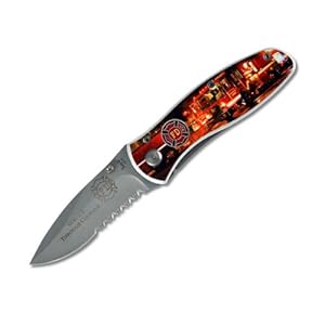 Product Description : The Fury 20791 Firefighter Logo Folding Knife from Joy Enterprises is our top selling gift item for friends and families of Firefighters. The full color artwork on the handle features Firefighters in action, the blade is engraved with "Service Through Courage" and a Fire Department Logo. A great gift for that hero in your life. Fury . . . Value by Design