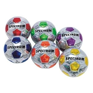 Product Description : The coolest, most colorful soccer ball set around! Features blazingly bright metallic panels that alternate between silver and a Spectrum color. The 3.0 mm thick cover includes a foam backed and a 2 ply fabric backing. The bladder features and blend of butyl and natural rubber for superior performance. Machine stitched.; ; Don't pay a lot and still bring your "A" Game.; That's the Spectrum Difference.; ; Spectrum products deliver superior quality at a price that's easy on your wallet.; ; Tough enough for regular use in the gym or on the playground, great for training, perfect for introducing kids to sports and What a Selection! ; ; Get Spectrum and Get Playing!